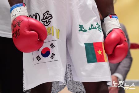 카메룬 출신의 ‘난민 복서’ 이흑산이 29일 오후 서울 홍은동 그랜드 힐튼호텔에서 챔피언 정마루와 세계복싱협회(WBA) 아시아 웰터급 타이틀매치를 갖고 있다. 이흑산의 트렁크에는 태극기와 카메룬 국기가 나란히 새겨져 있다.