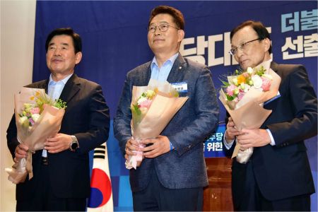 26일 오후 국회 의원회관에서 열린 더불어민주당 당 대표 선출을 위한 예비경선에서 본선 진출을 확정한 김진표, 송영길, 이해찬 후보자가 꽃다발을 들고 기념촬영을 하고 있다. 윤창원기자