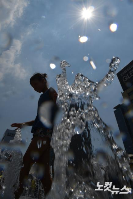 1일 중부 내륙 지역을 중심으로 최고 40도에 가까운 극한 폭염이 이어지며 역대 고온 기록을 갈아치운 1일 서울 광화문광장 바닥분수에서 어린이들이 더위를 식히고 있다. 전국 최고 기온을 기록한 강원도 홍천은 이날 오후 40.3도까지 올라 1942년 대구의 40도 기록을 76년 만에 깼다.