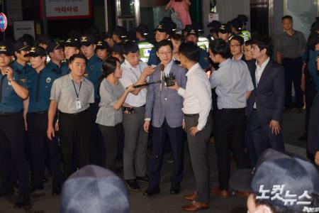 '드루킹' 일당의 댓글 공작에 연루된 의혹을 받고 있는 김경수 경남도지사가 7일 새벽 서울 서초구 허익범 특별검사 사무실에서 피의자 신분으로 조사를 마친 뒤 귀가하고 있다.