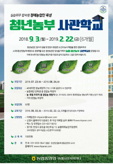 교육 과정은 9월 3일~내년 2월 22일까지 6개월 동안 합숙 방식으로 진행되며 농업 분야를 배우고 싶은 만 40세 미만의 청년이면 누구나 지원할 수 있다.