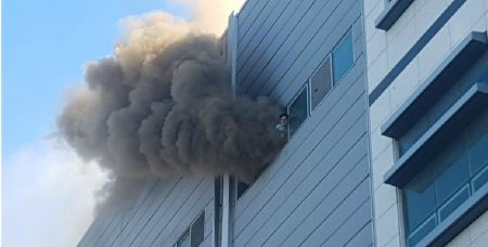 21일 오후 인천시 남동구 논현동 한 전자제품 제조 공장에서 불이난 가운데 공장 근로자가 구조 요청을 보내고 있다. (사진=인천소방본부 제공)