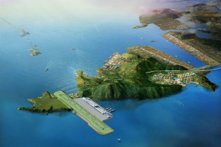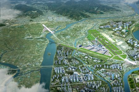 김해신공항 조감도. 붉은선 부분이 확장할 활주로지만 주변에 아파트 등 주거지가 있어 소음 피해가 문제가 되고 있다.붉은선 오른쪽은 현재 활주로.(사진=부산시 제공)