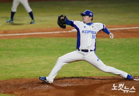 26일(현지시간) 오후 인도네시아 자카르타 겔로라 붕 카르노(GBK) 야구장에서 열린 2018 자카르타·팔렘방 아시안게임 야구 조별리그 B조 1차전 대한민국과 대만의 경기에서 1회초 양현종이 역투를 하고 있다.