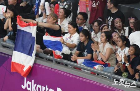 31일 오후 (한국시간) 인도네시아 자카르타 겔로라 붕 카르노(GBK) 배구장에서 열린 '2018 자카르타-팔렘방 아시안게임 여자 배구 4강전 한국-태국의 경기 1세트에서 태국 응원단이 파이팅을 외치고 있다.