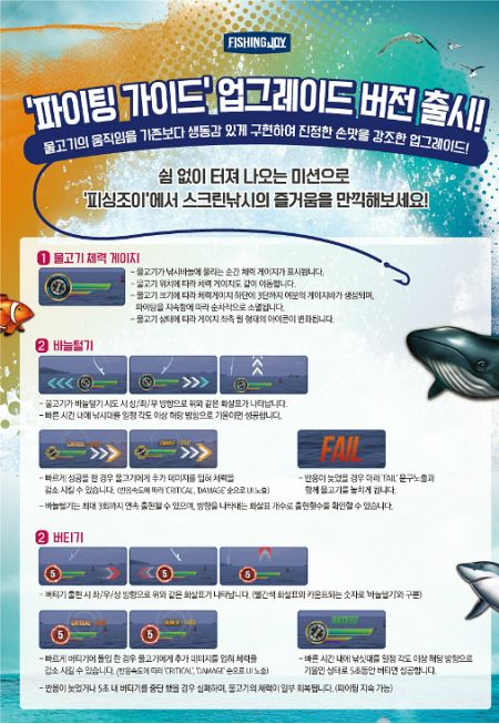 업그레이드 된 파이팅 가이드는 기존의 단순했던 '릴링'과 '좌우 바늘 털기'에서 벗어나 '물고기 체력게이지'를 중심으로 '위로 바늘 털기', '3연속 바늘 털기', '상, 좌, 우 버티기' 등 여러 가지 움직임을 추가했다.