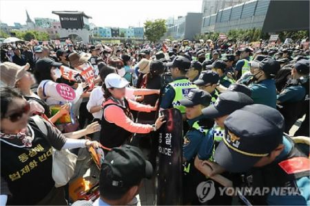 일부 반대단체 회원들은 경찰과 심한 몸싸움을 벌이다가 행사장 밖으로 끌려나갔다.