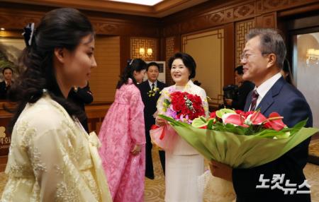 [평양회담]꽃다발 받는 문재인 대통령 내외