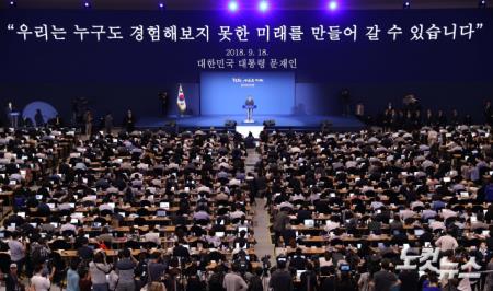 문재인 대통령이 2박3일간 평양 남북정상회담 일정을 마치고 20일 서울 중구 동대문디자인플라자에 마련된 메인프레스센터를 방문해 대국민 보고를 하고 있다.