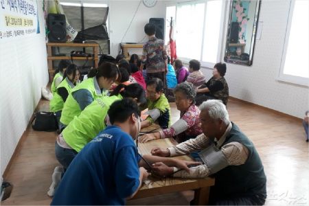 호산대 간호학과 봉사동아리 학생들이 일촌맺기 행사를 마친 후 어르신들의 혈압을 체크하고 있다