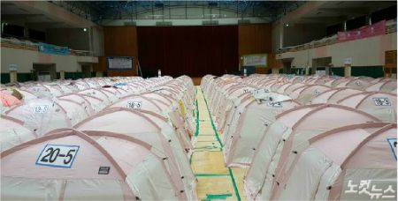 그러나 외벽 곳곳이 갈라지거나 부서졌지만 정밀점검 결과 이주 수준의 '위험 등급'을 받지 못한 91가구 208명의 이재민은 집으로 돌아가지 않고 흥해실내체육관에 마련된 임시구호소에 남아 있다.