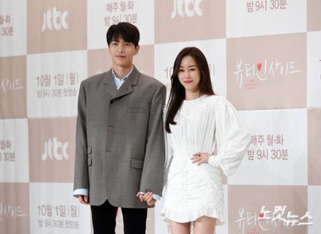 배우 이민기-서현진이 1일 오후 서울 영등포구 타임스퀘어 아모리스홀에서 열린 JTBC 월화드라마 뷰티 인사이드 제작발표회에서 포즈를 취하고 있다.