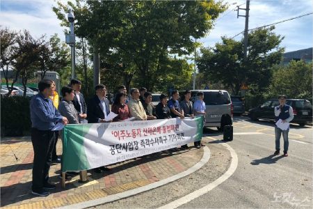 광주전남 지역 시민사회단체가 이주노동자 산재사고를 은폐하고 불법 파견하는 업체에 대한 행정기관의 수사를 촉구하고 있다(사진=광주CBS 박요진 기자)