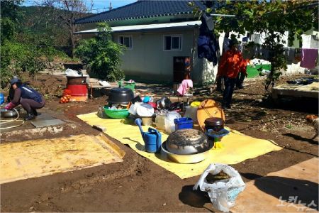 이른 아침부터 마을주민들과 대한적십자 등 자원봉사자 60여 명이 구슬땀을 흘리며 복구작업에 한창이었다.