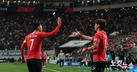 12일 오후 서울 마포구 월드컵경기장에서 열린 축구대표팀 평가전 대한민국과 우루과이의 경기에 나선 한국 대표팀 황의조(오른쪽)가 선제골을 성공시킨 뒤 손흥민과 하이파이브 하고 있다.