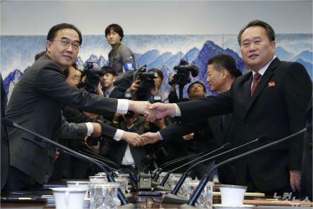 남북고위급회담 남측 수석대표 조명균 통일부 장관과 북측 수석대표 리선권 조국평화통일위원회 위원장이 지난 15일 판문점 남측 평화의집에서 남북고위급회담 전 악수하고 있다. (사진=사진공동취재단/자료사진)