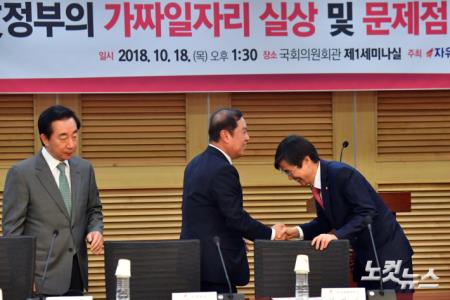 자유한국당 김병준 비상대책위원장과 김성태이 18일 국회 의원회관에서 열린 '文정부의 가짜일자리 실상 및 문제점 토론회에 참석하며 조경태 의원과 인사를 하고 있다.