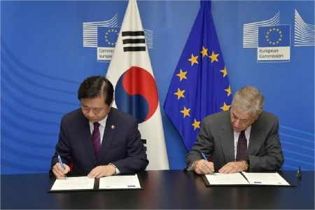 해양수산부 김영춘 장관은 18일 오전(현지시간) 벨기에 브뤼셀에서 EU 해양수산총국 카미누 벨라 해양수산집행위원(장관급)과 '국제적인 IUU(불법·비보고·비규제) 어업 근절을 위한 한·EU 공동선언' 서명식을 가졌다.