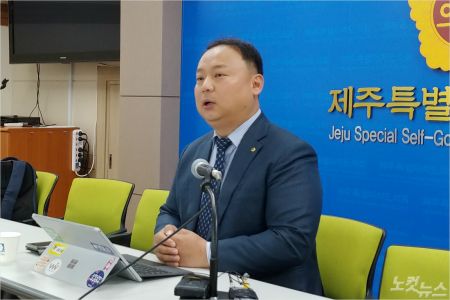 제주도의회 도민의방에서 22일 기자회견하는 재밋섬 파크 이재성 대표.