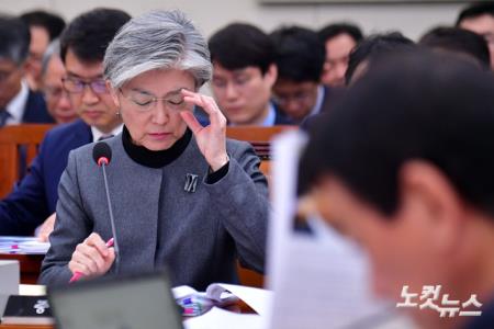 외교부 종합국감, 안경 만지는 강경화 외교부 장관