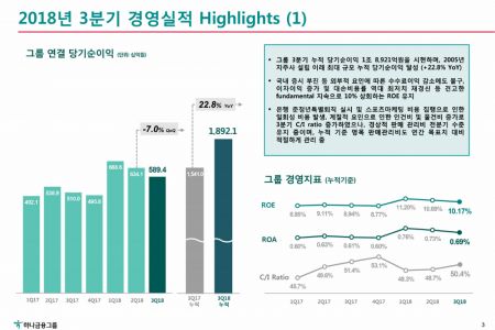 하나금융은 26일 3분기 실적 발표를 통해, 2005년 지주사 설립 이래 최대 규모의 누적 당기순이익을 달성했다고 밝혔다. 3분기 누적 순이익은 전년동기 1조5410억원 대비 22.8% 급증한 것이다.