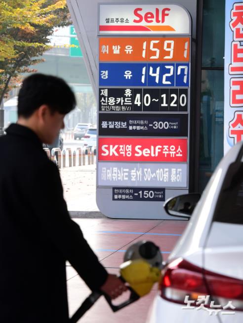 정부의 유류세 15% 인하 방침이 시행된 6일 오후 서울 영등포구 한 직영주유소에서 리터당 가격이 전날보다 휘발유는 123원 내린 1591원, 경유는 87원 내린 1427원에 판매되고 있다.