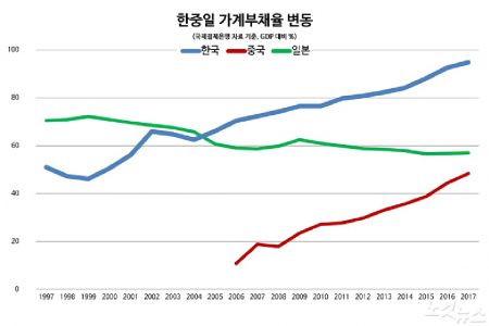 9일 국제결제은행(BIS)의 최신 통계에 따르면 국내 가계신용은 지난해말 GDP 대비 94.8%다. 올해 1분기에는 95.2%로 늘면서 꾸준한 증가세다. 중국(48.4%→49.3%), 일본(57.0%→57.4%)의 2배에 가깝다. 1997년 51.0%이던 국내 가계신용은 20년만에 43.8%포인트 급증했고, 같은 기간 일본(70.5%→57.0%)은 13.5%포인트 떨어졌다.
