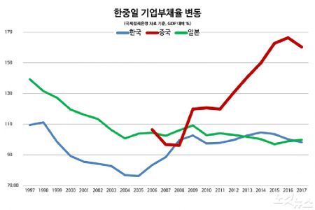 한중일 3국의 경제주체별 부채 편중 부문이 각양각색이다. 우리나라는 국내총생산(GDP)에 맞먹는 가계부채가 문제이고, 중국은 기업부채가 급증하고 있으며, 일본은 고질적인 정부부채가 도사리고 있다. 각국 정부 노력으로 개선되고 있지만, 완벽한 리스크 해소는 어려운 양상이다.