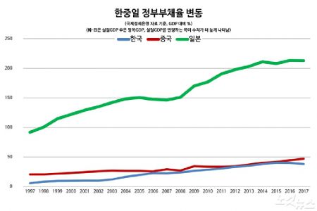 정부부채에서는 일본이 한중일 3국은 물론, 전세계에서 압권이다. 지난해말 BIS 기준 정부신용은 GDP 대비 212.9%, 2016년말 일본정부 발표 기준 부채(1270조엔 안팎)는 GDP 대비 235.63%다. 지난해말 BIS 기준 GDP 대비 정부신용은 우리나라 38.1%, 중국 47.0%로 현격히 낮다.