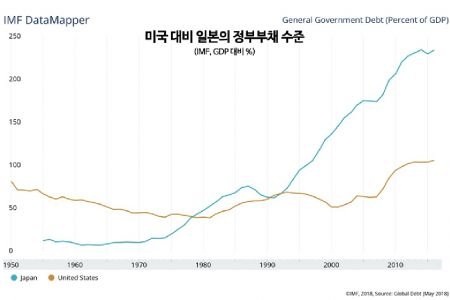 2016년 OECD 회원 34개국 가운데 GDP 대비 정부부채가 200%를 넘긴 나라는 일본이 유일하다. 국가를 총동원해 이룬 경제성과를 2년 내내 차곡차곡 모아도 정부 빚을 다 못 갚는 나라라는 얘기다. 한국은행에 따르면 2차대전 패전 직전인 1944년 일본의 GDP 대비 국가부채가 204%였다.