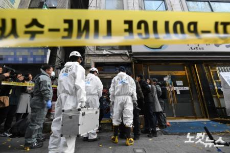 10일 오전 서울 종로구 관수동 고시원 화재현장에서 국과수 및 경찰·소방 관계자들이 합동감식을 위해 건물로 들어서고 있다.