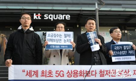 28일 오전 서울 종로구 KT 광화문 지사 앞에서 열린 KT 아현지사 화재 관련 통신공공성 확대 및 추가피해 보상 촉구 기자회견에서 참여연대 민생희망본부 관계자들이 손피켓을 들고 있다.
