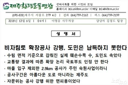 제주환경운동연합 6일 성명..."교통량 조사도 타당성 떨어져"