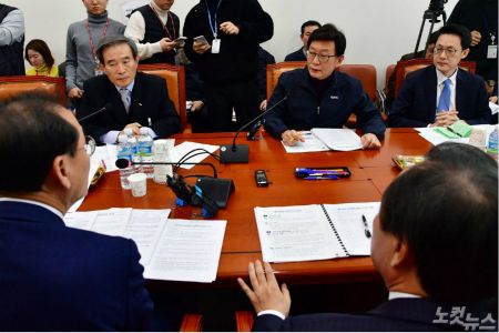 김병숙 한국서부발전 사장(좌측)과 황창하 한국지역난방공사 사장(가운데)이 14일 오후 국회에서 열린 충남 태안화력발전소 비정규직 노동자 사망사건과 한국지역난방공사의 경기도 고양시 백석역 인근 열수송관 누수 사건과 관련한 현안보고를 위한 국회 산업통상자원중소벤처기업위원회 회의에서 출석해 의원들의 질의를 받고 있다. (사진=윤창원 기자)