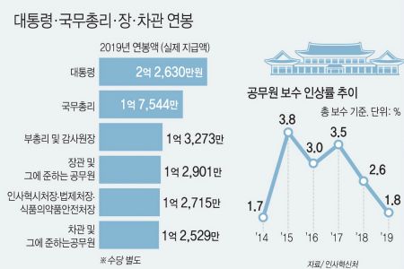 수당을 제외한 2019년 대통령의 연봉은 2억2천629만7천원, 국무총리는 1억7천543만6천원, 부총리·감사원장은 1억3천272만7천원 정도 각각 될 것으로 파악됐다.