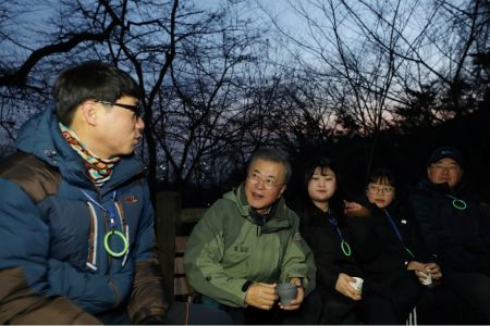 문재인 대통령이 새해 첫날인 1일 '2018년을 빛낸 의인' 박재홍·유동운·박종훈·안상균 씨와 민세은·황현희 양 등과 함께 남산으로 신년맞이 해맞이 산행을 하다 잠시 얘기를 나누고 있다 (사진=청와대 제공)