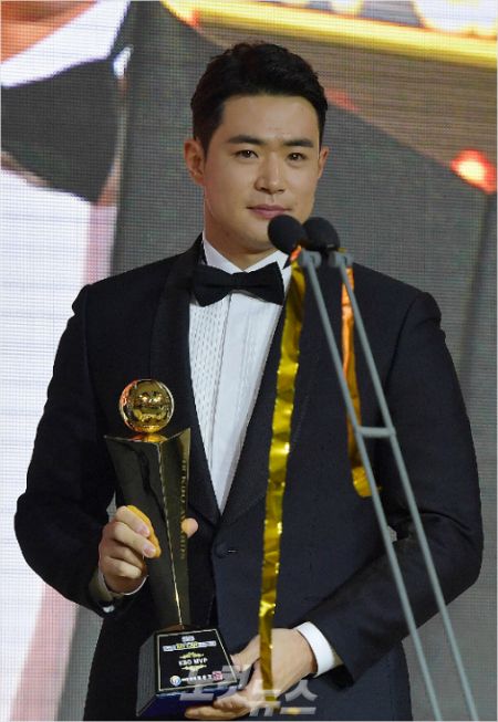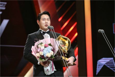 '내년에는 NC 골글?' 양의지가 2018년 KBO 리그 골든글러브 시상식에서 포수 부문에서 수상한 뒤 소감을 밝히는 모습.(사진=KBO)
