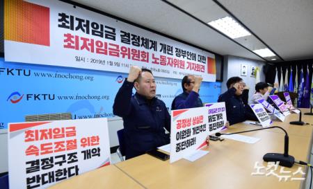 양대노총을 비롯한 최저임금위원회 노동자위원들이 9일 오전 서울 여의도 한국노총 대회의실에서 최저임금 결정체계 개편 정부안에 대한 기자회견을 갖고 구호를 외치고 있다.