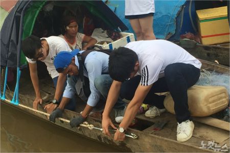 건양대 학생들이 보트에서 고기를 잡는 캄보디아 현지 주민을 위해 햇빛을 차단하는 그늘막을 설치해주고 있다. (사진=자료사진)