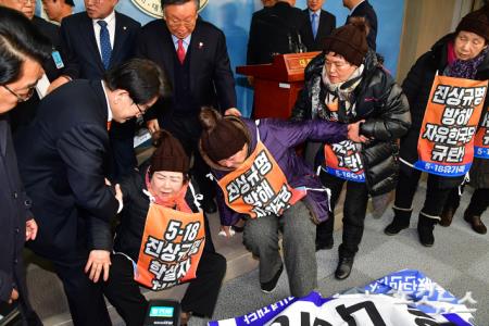 5.18 민주화운동 피해자 가족들이 14일 국회 정론관에서 자유한국당의 5.18진상규명 조사위원 추천과 관련 기자회견을 마치고 자리에서 일어나고 있다.