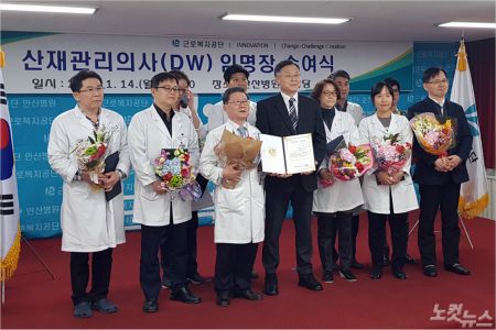 근로복지공단(이사장 심경우)은 14일(월) 경기도 안산시에 위치한 근로복지공단 안산병원 대강당에서 산재관리의사(Doctor of Work-related accident, DW) 39명에 대한 임명장 수여식을 가졌다.