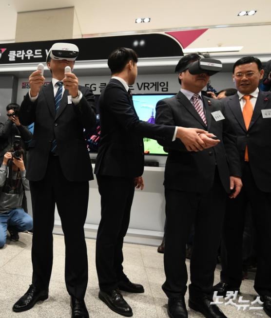 홍종학 중소벤처기업부 장관, 성윤모 산업통상자원부 장관(오른쪽)이 22일 오후 서울 강서구 LG사이언스파크에서 열린 5G 중소기업 상생간담회에 앞서 5G VR게임을 시연하고 있다.