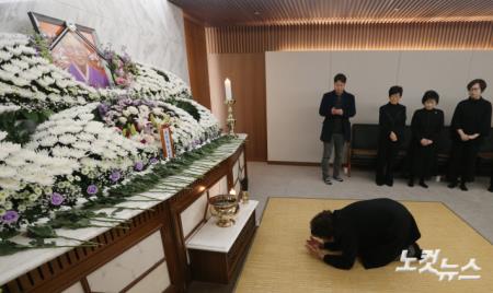 29일 서울 서대문구 세브란스 병원 장례식장 특실에 마련된 일본군 성노예 피해자 고 김복동 할머니 빈소를 찾은 배우 나문희가 조문을 하고 있다.