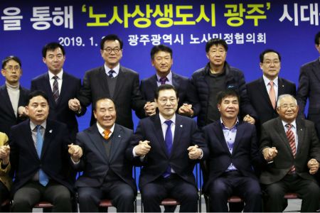 30일 오후 광주시청 중회의실에서 광주시 노사민정협의회를 시작하기 앞서 위원들이 기념촬영을 하고 있다. (사진=연합뉴스 제공)