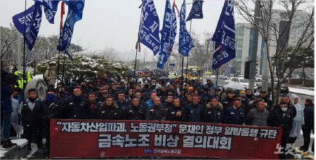 이어 전국금속노조 현대·기아차지부는 이날 오후 1시부터 광주시청 앞 도로에서 광주형 일자리 규탄 비상 결의대회를 진행 중이다.