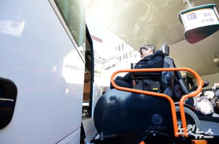 1일 오전 서울 서초구 고속버스터미널에서 열린 ‘휠체어 탑승 가능 고속·시외버스 시승행사’ 에 참여한 한 장애인이 리프트를 이용해 버스에 탑승하고 있다.
