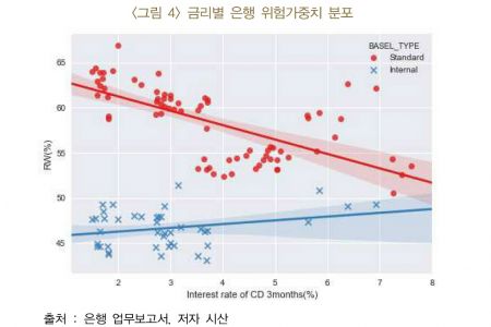 연구팀은 2000년 3월부터 지난해 6월까지의 각 은행 자료를 취합해, 단기금리(91일물 CD금리), 은행의 수익성(순이자마진), 자본구조(기본자본비율) 등 변화에 따른 위험가중치의 추이를 살펴봤다.