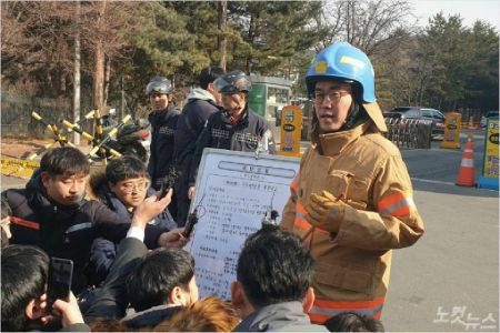 소방 관계자가 14일 폭발 사고로 3명이 숨진 한화 대전공장 앞에서 사고 경위를 설명하고 있다. (사진=인상준 기자)