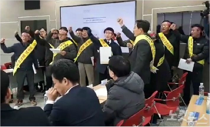 26일 금강 공주보 처리를 위한 민·관협의체 회의에서 농민단체 등 민간위원들이 "공주보 해체를 결사반대한다"는 구호를 외치고 있다. (사진=고형석 기자)
