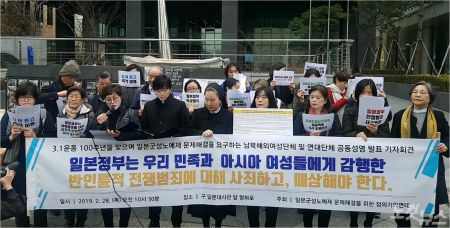 정의기억연대와 한국교회여성연합회 등 여성단체들은 28일 서울 종로구 평화의 소녀상 앞에서 기자회견을 열고, "일본 정부는 우리 민족과 아시아 여성들에게 감행한 반인륜적 전쟁범죄에 대해 사죄하고 배상하라"고 주장했다.